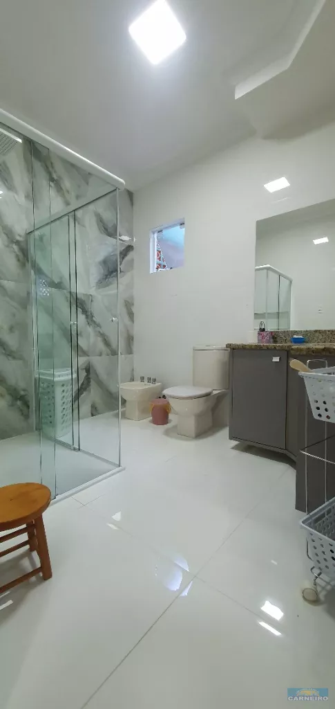 Casa em alvenaria, com 1 suite, com clouset, mais uma quarto com sacada privativa e quarto com clouset, toda com laje e gesso, piso porcelanato e laminado. Area de festa com churrasqueira e garagem.